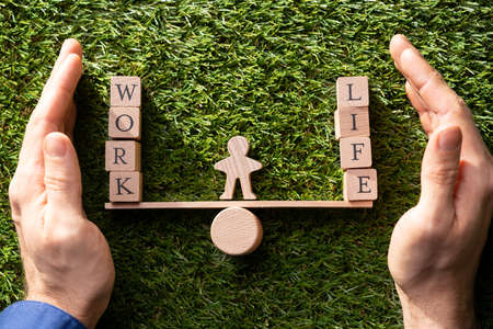 A Person's Hand With Human Figure Standing Between Work And Life Wooden Blocks On Seesaw
