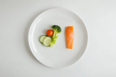 This top-down highlights shot a minimalist white plate with fresh veggies, lean salmon, and whole grains, reflecting a healthy lifestyle.