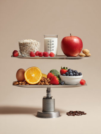 Creative still life with fruits balanced on a scale, symbolizing a healthy diet