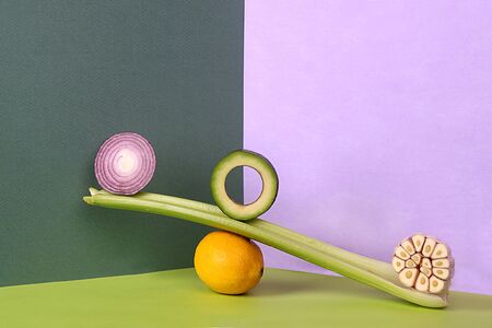 Modern trendy still life with slieces fruits and vegetables on colorful background. Balanced composition with slices of red onion, avocado, garlic set on celery leaf set over whole lemon.