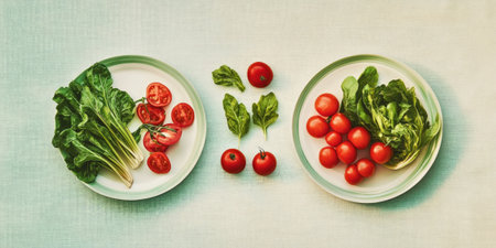 Fresh spinach and tomato arrangement on plates with basil leaves.