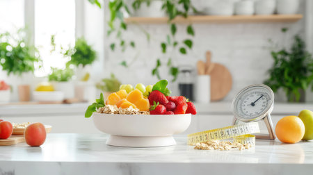 A vibrant fruit bowl featuring a mix of strawberries, oranges, and melon sits on a marble kitchen counter beside oats and a measuring tape, emphasizing healthy living.