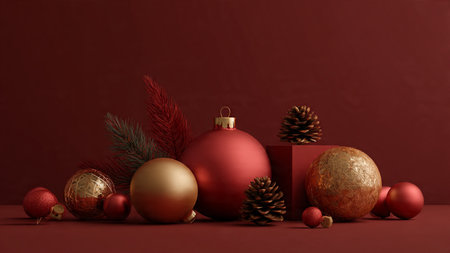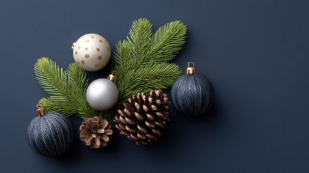 A visually appealing arrangement of decorative Christmas ornaments and pine cones, perfect for enhancing festive holiday celebrations and winter decor.