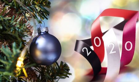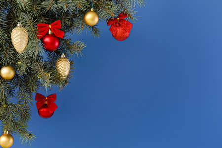 New Year Christmas tree toy, branches of a christmas tree, New Year decorations on a colored background.