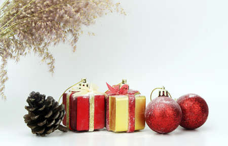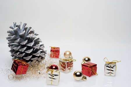 Christmas decoration balls pine and ornaments over abstract background on white background. Holiday background greeting card for Christmas and New Year. Merry Christmas
