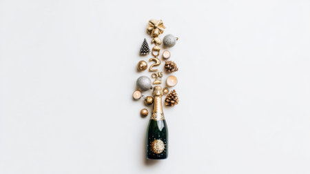 A festive arrangement featuring a champagne bottle with gold and silver Christmas ornaments forming a tree shape on a white background.