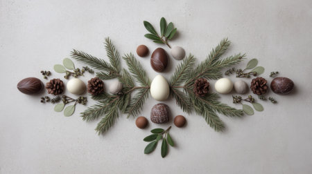 A visually appealing arrangement of chocolate eggs and pine cones surrounded by greenery, perfect for showcasing seasonal themes and festive moments.