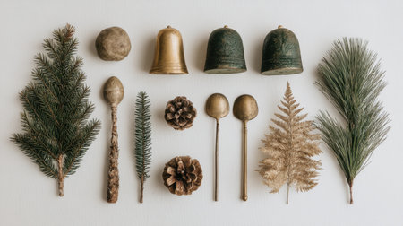 A beautifully arranged flatlay featuring rustic winter decor elements such as pine branches, vintage bells, and elegant spoons. Perfect for seasonal inspiration.