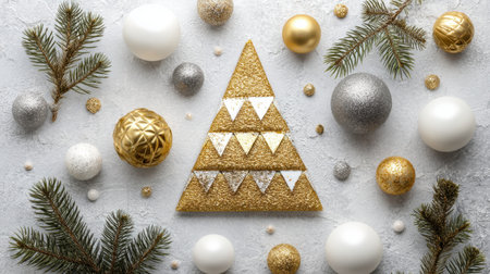 A captivating arrangement of a golden Christmas tree shape with shiny ornaments and pine sprigs, perfect for inspiring holiday decorations and festive celebrations.