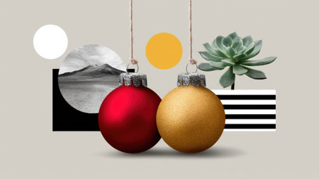 Collage modern holiday ornament composition with red and gold bauble succulent geometric shapes festive minimal scene collage