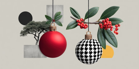 Collage modern holiday ornament arrangement with red berry branch and black houndstooth bauble evoking festive calm and minimalist style