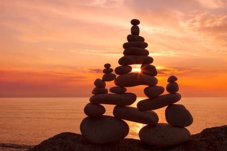 Stones pyramid on the seashore at sunset