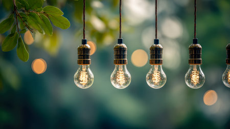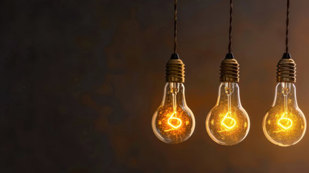 Bright and warm glowing light bulbs hang elegantly against dark background, creating cozy and inviting atmosphere. vintage design adds touch of charm and nostalgia