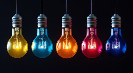 Five glowing light bulbs in different colors hang from black wires against a solid dark background, creating a striking visual contrast and a warm atmosphere.