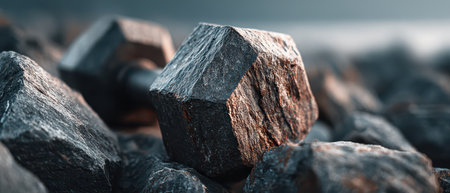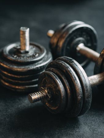 Close-up view of various weights stacked on a dark surface, highlighting their texture and design in a fitness setting, perfect for workout inspiration.