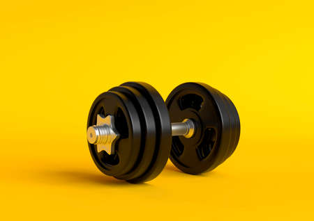 Dumbbell with black plates isolated on pastel yellow background. Front view with copy space. Creative concept. 3d rendering illustration