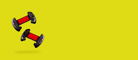 Gamepad banner. Two consoles for phones hanging in air on vibrant yellow background. Smartphones games concept. Copy space.
