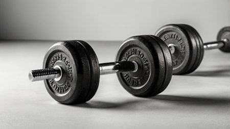 A sleek black and silver dumbbell resting on a minimalist white surface, casting dynamic shadows.