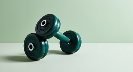 Two green dumbbells on a white table in front of a green background