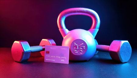 Kettlebells, dumbbells and credit card on black background