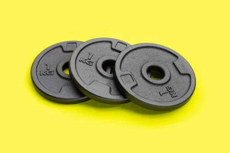 Black weight plates on green background. Gym equipment