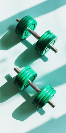 Two green adjustable dumbbells are placed on a pastel blue surface, with harsh sunlight creating strong shadows, symbolizing strength training and a healthy lifestyle