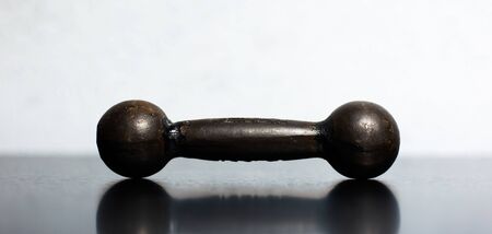 Close-up of small dumbbell on black table.