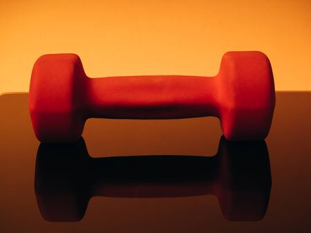Orange dumbbells for fitness on an orange background. Reflected from the glass surface of the balance. The concept of sports and healthy lifestyle.