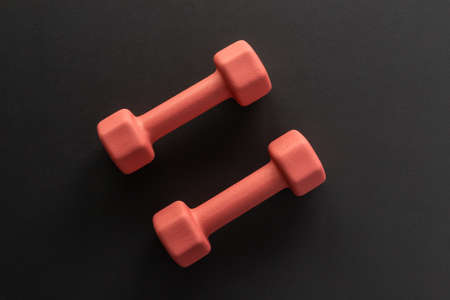 Dumbbells on black background. Fitness, sport and workout concept flat lay. Weights layout with copy space