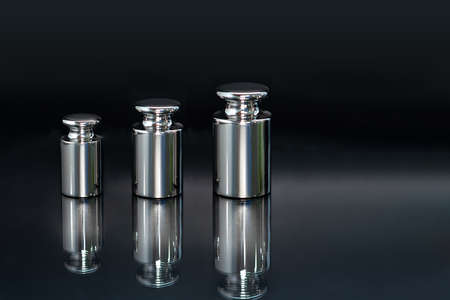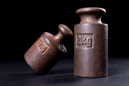 Metal weights for measuring weight. Standard for weighing goods. Dark background.