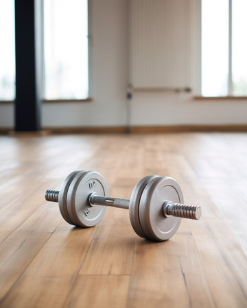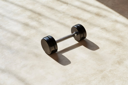 Dumbbell resting on a concrete floor, morning sun casting window shadows, symbolizing fitness, strength, and a healthy lifestyle