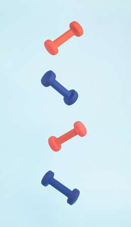 Pink and blue exercise dumbbell weights flying and floating in air in strong graphic line for art fitness and achievement concept.