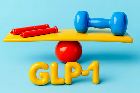 GLP-1 injection pens balancing colorful dumbbell on toy-like seesaw