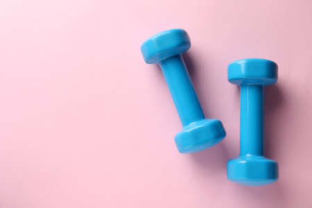 Turquoise dumbbells on pink background, flat lay. Space for text