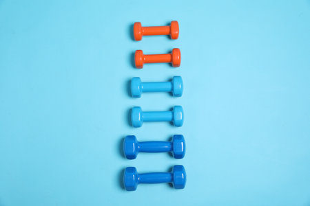 Different dumbbells on light blue background, flat lay