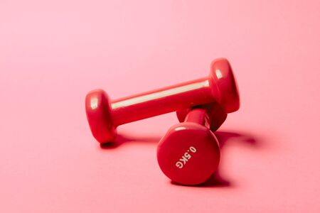 Pair of red 0.5 kg dumbbells on pink paper background.