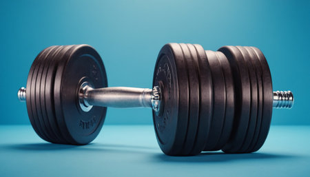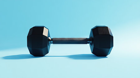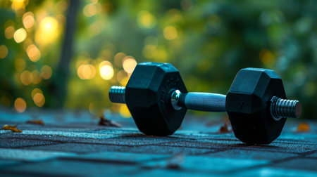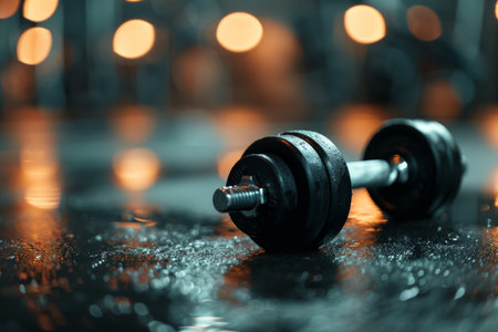 A sleek black dumbbell rests on a glossy surface, surrounded by soft elegant lights. Ideal for fitness themes, this image captures the essence of training and motivation.
