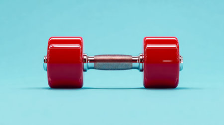A vibrant glossy crimson weight rests on an even azure background, with a textured grip emphasizing durability, evoking energy and resilience in fitness routines.