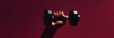 Strong hand lifting dumbbell against burgundy backdrop, symbolizing fitness, workout, exercise, gym training, and active lifestyle