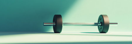 Metal barbell with weights lying on floor in empty gym with teal wall and floor, representing fitness, strength training, and healthy lifestyle