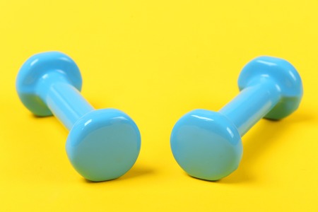 Pair of lightweight dumbbells in blue color isolated on bright yellow background as symbol of sports and workout
