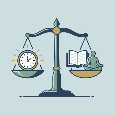 An image portrays a clock scale design, balancing elements representing work and life. The composition features a vintage clock face in the center, with scales holding items. The scene uses soft lighting with a city skyline in the background, suggesting a serene environment. This image is suitable for various commercial or editorial uses.