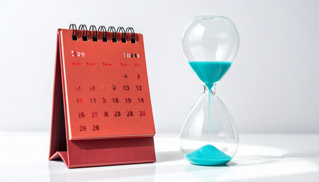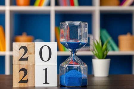 Table planner with hourglass of sand flowing on table. Annual planning concept.