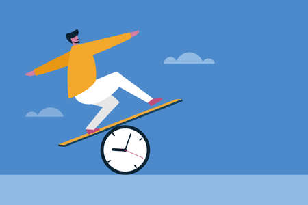 Conceptual illustration of a man moving ahead by a balanced walk on a clock