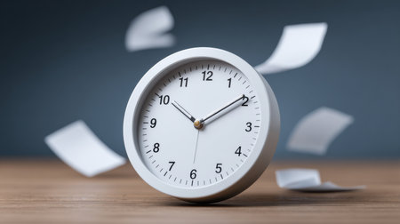 A classic round clock stands on a wooden table, surrounded by flying papers, symbolizing time management, urgency, and productivity in a modern workspace.
