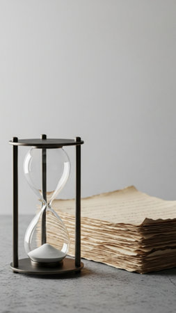 A striking vertical, tall 9:16 composition featuring a large, elegant sand hourglass and a substanti