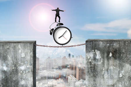 Businessman balancing alarm clock on rusty chain connected two high dirty concrete walls, with sun sky cityscape background.