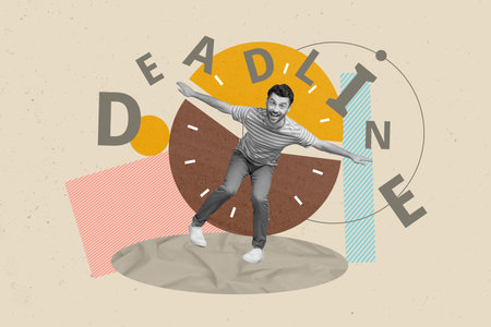 Collage photo of funny young overjoyed guy makes creative clock his arms like minute arrows deadline isolated on gray color background