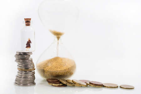Small woman in test tube on coins. Abstract photo of financial crisis.