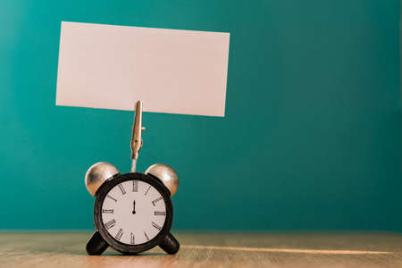 Alarm clock and banner with copy space on wooden table. Time management concept.